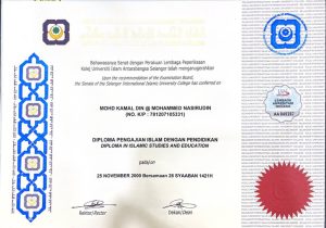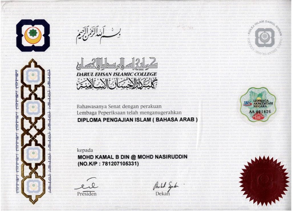Beliau seterusnya melanjutkan pelajaran di Kolej Islam Darul Ehsan dalam dua bidang serentak, iaitu Diploma Pendidikan Islam dan Diploma Bahasa Arab. Cita-cita beliau dalam bidang ilmu diteruskan dengan pengajian peringkat Ijazah Sarjana Muda di Universiti Wadi An-Nil, Barbar, Sudan.